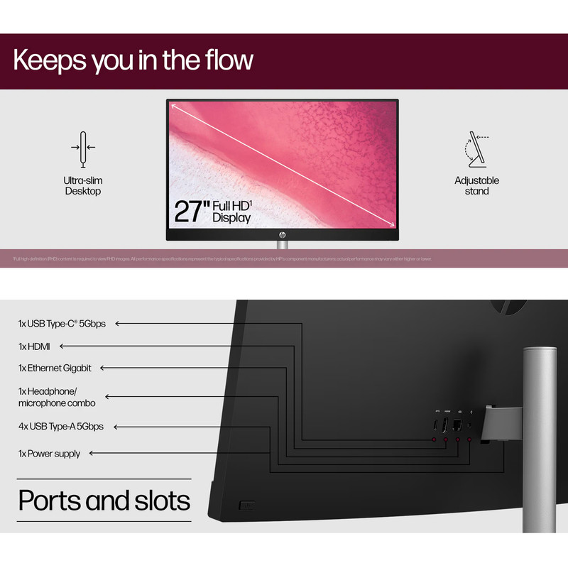 صفحه نمایش غیر لمسی 60.5 سانتی متری / پنل IPS / استاندارد three-sided micro-edge(حاشیه بسیار کم) / روکش مات ضد انعکاس نور / روشنایی 250 نیتس / گامت رنگی 72% NTSC / نسبت بدنه به صفحه نمایش ۹۸.۱۶%